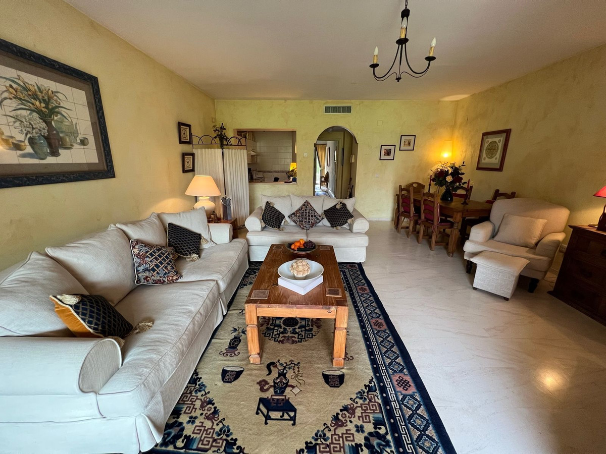 Apartamento en planta baja muy espacioso de un dormitorio con acceso directo a los jardines comunitarios y al área de la piscina.Con una ubicación privada en el corazón del complejo, este apartamento es el lugar perfecto para relajarse y disfrutar de su tiempo libre, mientras que su conveniente ubicación significa que está a muy poca distancia en coche de escuelas, supermercados, tiendas, restaurantes y los pueblos de Benahavis con su delicias gastronómicas, San Pedro de Alcántara y Estepona.Tan pronto como ingresa al apartamento, no puede evitar notar las generosas proporciones que son inusuales en un apartamento de una habitación. La sala_comedor ofrece espacios para ver televisión, socializar con amigos y leer. Da a una terraza privada ya los hermosos jardines de esta, la tercera fase del complejo. Hay una de las tres piscinas comunitarias a pocos metros de la terraza.El dormitorio está en el lado opuesto del apartamento por lo que mantiene la misma temperatura durante todo el año. Cuenta con walk in closet y baño completo contiguo al mismo. Los propietarios actuales han optado por no tener aire acondicionado instalado, pero hay una preinstalación, por lo que sería fácil de hacer.El apartamento es perfecto para una pareja que busca pasar unas vacaciones más largas en España en una zona conocida por sus campos de golf, clubes de tenis, playas y mucho más.