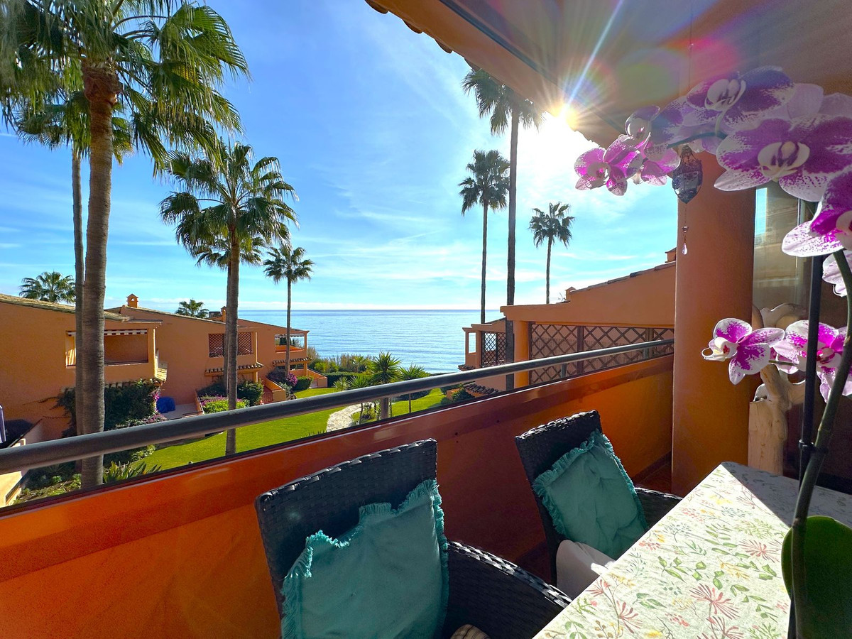 ESPECTACULAR APARTAMENTO FRENTE AL MAR, ubicada en Estepona, en un hermoso y tranquilo complejo residencial, CON ACCESO DIRECTO A LA PLAYA y al paseo marítimo. Situada cerca de los campos del golf, algunos de gran prestigio como Finca Cortesin... a medio camino entre Estepona y el famoso puerto de la Duquesa, donde encontrará gran selección de bares, restaurantes y zonas de ocio. Los comercios y tiendas más cercanas a tan solo 3 km. Esta propiedad está distribuida en una planta, con un gran salón que conecta a la bonita terraza cubierta y cerrada con lumon, con la opción de abrirlo o cerrarlo y donde disfrutara de especulares amaneceres y atardeceres sobre la playa y los jardines tropicales. Maravillosa cocina totalmente reformada con materiales de alta calidad y amplios armarios. Suelo de parquet en toda la vivienda. Orientada al sureste, lo que la hace muy luminosa. El complejo ofrece, zonas verdes y preciosa piscina comunitaria, de adulto y de niños, rodeada de un paraje único donde podrá disfrutar de todo lo que ofrece esta magnífica vivienda. Parking comunitario exterior a la entrada de la vivienda. Recomendamos visitarla