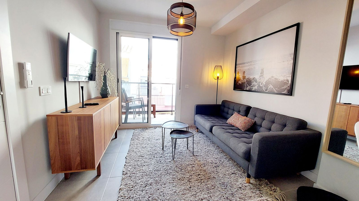 Precioso apartamento en el centro de Fuengirola, salón_comedor, cocina equipada, 2 dormitorios, 1 baño, terraza. Edificio construido en 2020, placas solares. Cerca de servicios y transportes. A 100 metros de la playa. Amueblado. Apartamento soleado y luminoso. Ideal para vivir o como inversión