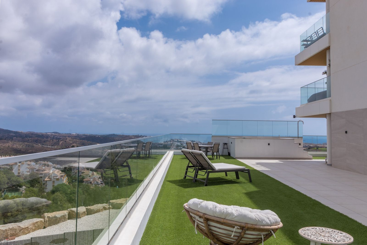 Exclusivo apartamento con un tamaño de terraza increíble y vistas panorámicas al marEste apartamento cuenta con 2 amplios dormitorios con baños en suite el dormitorio principal tiene un vestidor, un aseo de invitados, cuarto de servicio_lavadero, cocina abierta y una amplia zona de estar_comedor. Desde cada habitación, se pueden disfrutar de unas fantásticas vistas panorámicas al mar y al campo de golf. La propiedad está rodeada por una terraza parcialmente cubierta. Lo que hace que esta terraza sea realmente única es que una parte de ella ha sido diseñada como un jardín. Además, la terraza cuenta con una piscina privada, lo que aumenta su encanto.El complejo One Residences está situado en una ubicación panorámica única, a sólo unos minutos de todas las comodidades principales asi como las hermosas playas y al lado de la casa club de golf de Calanova, que cuenta con un excelente restaurante. El complejo ofrece todas las comodidades imaginables, incluyendo múltiples piscinas cubiertas y al aire libre, servicio de conserjería, cine, áreas para niños tanto en interiores como en exteriores, una zona de práctica de golf cubierta y mucho más.El precio incluye 2 plazas de aparcamiento subterráneo y un gran trastero con una altura de 7 metros, que ofrece un espacio de almacenamiento increíble.No pierda la oportunidad de reservar una visita realmente vale la pena
