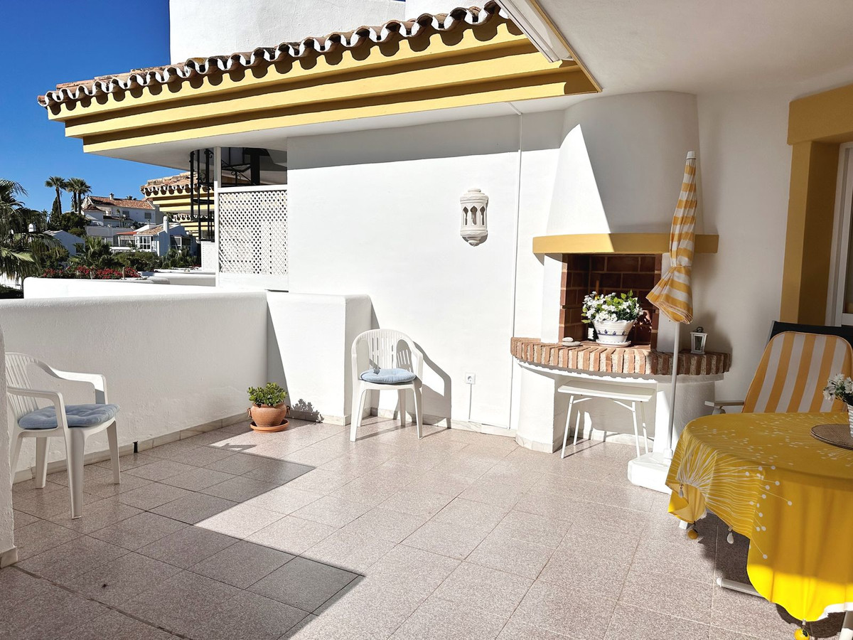 Penthouse with private roof terrace located in Calahonda approx. 15 minutes walk from restaurants and grocery store. The floor is located in a quiet, green area surrounded by the Calahonda golf course. Inside the area there are parking spaces for the residents.The apartment is on the second floor without a lift. It contains a hall, three bedrooms with wardrobes, two bathrooms with bathtubs, one of which is a suite, and a living_dining room with fireplace and open kitchen. From the living room and the large bedroom you have access to a large, lovely terrace of 25 m2 facing south with a brick barbecue and a spiral staircase that leads up to the large roof terrace. of 55 m2.The area is very well maintained with nice gardens and three communal pools, one of which is open all year round.