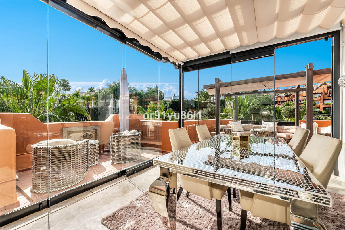 Este ático está situado en una de las mejores comunidades cerradas de Nueva Andalucía con seguridad las 24 horas. Una ubicación privilegiada entre los campos de golf y a 5 minutos de los servicios. Si busca privacidad, ha encontrado la suya. Es el único apartamento en la última planta del bloque mejor situado, lo que garantiza vistas panorámicas abiertas. Cuando entras en el apartamento, entras en un espacio de luz y tranquilidad. Se percibe un flujo fácil entre la zona interior y exterior creado a través de un espacio añadido de terraza cubierta de cristal cortinas que se puede abrir por completo. Esto le da la ventaja de poder disfrutar al máximo del clima soleado. Con ... metros cuadrados de terrazas, tiene infinitas posibilidades para personalizar su espacio al aire libre. La parte extendida desde el salón, sirve como zona de comedor donde tener unas preciosas vistas al mar. La terraza descubierta es perfecta para descansar, hacer una barbacoa y también ofrece un montón de espacio de almacenamiento. Desde aquí se divisa el paisaje tropical de la urbanización. Además, hay un rooftopterrace, donde se puede presenciar las puestas de sol más increíbles. De vuelta al interior, el salón disfruta de un concepto abierto. Aquí encontramos la moderna cocina a medida, equipada con los mejores electrodomésticos desde un horno de vapor hasta un calientaplatos. Además, hay 2 amplios dormitorios con 2 baños, el principal tiene su elegante baño privado. El apartamento cuenta con 2 amplias plazas de aparcamiento y 2 trasteros en el sótano.