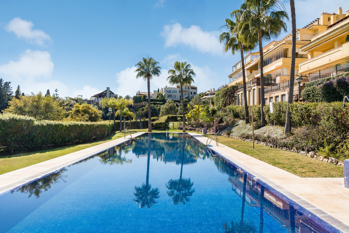 Estupendo ático en la urbanización cerrada con seguridad 24 H Condado de Sierra Blanca, Milla de Oro. A pocos minutos en coche de Puente Romano y sus exclusivos comercios. Orientación sur con vistas panorámicas al mar. Consta de Hall de entrada. Aseo de invitados. Amplio salón_comedor con acceso directo a la bonita terraza cubierta con pérgolas de madera. Cocina americana totalmente equipada. 3 dormitorios dobles. 2 cuartos de baño con calefacción por suelo radiante. 2 plazas de parking y un trastero incluidos.El complejo cuenta con extensos jardines maduros y 2 piscinas comunitarias.