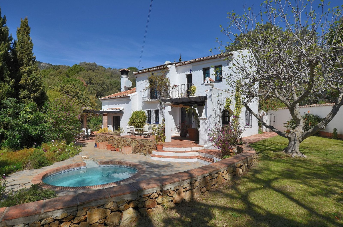 Amplia finca con vistas a las montañas y al mar en Casares, cerca de Estepona. Situada en una zona muy tranquila, lindando con el Parque Natural y rodeada de alcornoques centenarios y hermosas vistas a las montañas. Esta propiedad se encuentra en plena naturaleza y tiene un cómodo acceso, a sólo 2 minutos de la carretera principal. El tamaño total construido es de 314m2, del cual 275 m2 corresponden a la casa y 39m2 al garaje taller de trabajo.Un portón automático da acceso a un camino pavimentado. Hay un amplio aparcamiento en la parte delantera de la propiedad, un garaje cerrado con capacidad para un coche y un amplio taller de trabajo. Accedemos a la casa a través de un acogedor patio andaluz. En la planta principal encontramos un salón, comedor, una luminosa sala para desayunar o almorzar y un lavadero conectados a una cocina totalmente equipada. Desde la cocina y el salón hay acceso a una terraza exterior con vistas panorámicas. La terraza también cuenta con zona de barbacoa, jardín y jacuzzi. La planta baja se completa con un dormitorio con baño en suite y un aseo de invitados.En la planta alta, se encuentra el dormitorio principal con baño en suite y un precioso balcón con bonitas vistas. En esta planta también hay otros dos dormitorios y un baño compartido. Además, hay un altillo justo encima del salón utilizado como oficina. En el exterior hay muchas zonas de relax y terrazas. También se puede disfrutar de un precioso jardín y una gran piscina con mucha privacidad gracias a los árboles que rodean la propiedad. La parcela de 10.000 m2 tiene senderos que llevan a zonas con hermosas flores silvestres y árboles frutales.Villa en impecable estado de conservación, lista para entrar a vivir. Esta propiedad se encuentra conectada a la red eléctrica y tiene agua de la red. Dispone de instalación de paneles solares y calefacción central con radiadores en todas las habitaciones. Las ventanas son de doble acristalamiento. Hay sistema de alarma y sistema de riego automático para el jardín. Esta encantadora villa andaluza se encuentra a sólo 7 minutos en coche de Casares, a 15 minutos de la playa y a una hora del aeropuerto internacional de Málaga. A sólo 15 minutos en coche, encontrará excelentes campos de golf, como el famoso complejo Finca Cortesín. A 25 minutos del Colegio Internacional de Sotogrande y de varios puertos deportivos. Estepona está ubicada a tan solo 20 minutos.