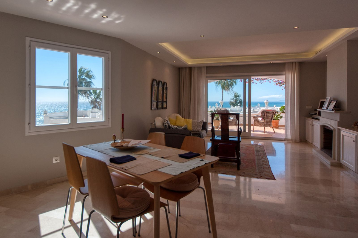 Fantástica casa adosada en primera línea de playa en Playa Victoria, Estepona. La propiedad tiene magníficas vistas al mar no sólo desde la terraza sino también desde la mesa del comedor o la cocina. La casa es muy privada y ofrece entrada con aseo para invitados, cocina totalmente equipada con trastero, salón_comedor con acceso a la terraza parcialmente cubierta. El dormitorio principal original se ha convertido en un segundo salón y los dos dormitorios más pequeños se han convertido en un gran dormitorio principal. Dos baños con ducha. Como la propiedad está ubicada en una esquina, tiene ventanas adicionales que le dan mucha luz extra. Suelos de mármol, suelo radiante en los baños, aire acondicionado frío y calor. Fácil acceso al puerto de Estepona por el nuevo sendero que bordea la playa. Victoria Beach cuenta con piscina comunitaria, jardines bien cuidados y acceso directo a la playa.