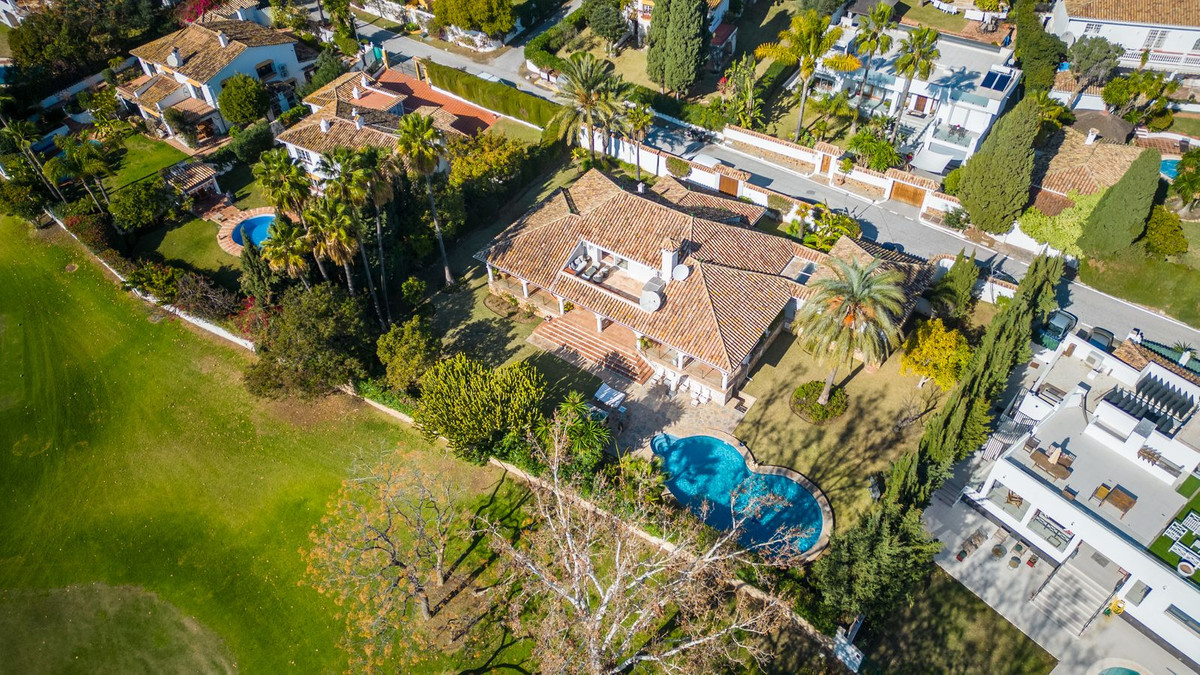 VILLA EN PRIMERA LÍNEA DE GOLF CON GRAN PARCELA EN GUADALMINAElegante, cómoda y espaciosa villa, con una posición privilegiada en primera línea de golf, en una de las zonas más demandadas y exclusivas de Marbella, a sólo unos minutos caminando de la casa club, el centro comercial dónde podrá disfrutar de todo tipo de servicios y junto a la playa, San Pedro de Alcántara y el colegio San José.La propiedad destaca por su gran parcela con orientación sur con acceso directo al campo de golf, y amplios espacios interiores, distrbuida en dos plantas con un total de cuatro dormitorios, cuatro cuartos de baño y un aseo.La planta baja cuenta con tres dormitorios, gran salón con chimenea y zona de comedor junto a una cocina semi abierta y salida directa a la zona de porche donde podrá disfrutar de bonitas vistas al campo de golf. La planta superior cuenta con un dormitorio principal de gran tamaño con baño en suite y terraza con vistas al campo de golf.Además cuenta con zona garaje, y un semisótano en bruto.Exteriormente la propiedad cuenta con una parcela de 1,518m2 con gran jardín, piscina privada y jacuzzi.Una propiedad ideal, para los clientes que quieran disfrutar de una gran casa, con una ubicación privilegiada con acceso directo al campo de golf, en una de las zonas más demandadas de Marbella.
