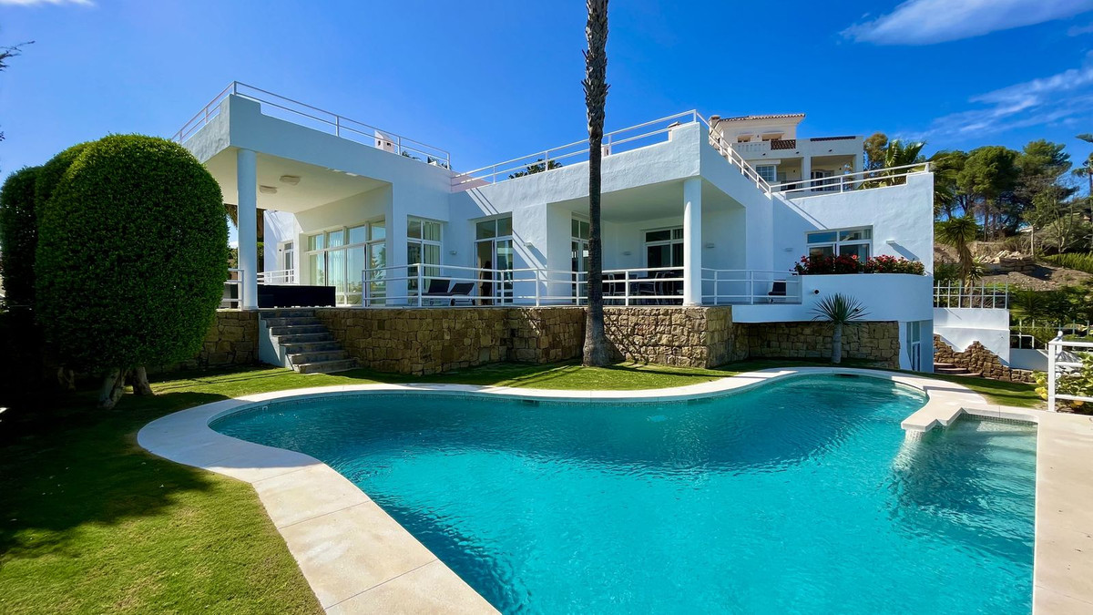 Villa única de estilo contemporáneo ubicada en las colinas con vistas a la montaña de La Concha, el Valle del Golf, la costa mediterránea y africana.El hall de entrada de mármol portugués conduce a una moderna sala de estar de nivel dividido que está inundada de luz y ofrece increíbles vistas panorámicas desde todos los ángulos. La sala de estar inferior cuenta con un tragaluz de diseño, balaustradas divididas de cromo, varias características de iluminación y una gran chimenea. A la izquierda de la sala de estar, una cocina con isla central SieMatic totalmente equipada da al comedor separado que da paso a una de las muchas terrazas que rodean la casa con sol todo el día.Cuatro dormitorios con baños en suite se distribuyen en esta misma planta y se encuentran a ambos lados del salón y el comedor mientras que hay un cuarto de invitados independiente y espacioso con baño en suite en el área del jardín inferior con acceso independiente.El garaje para tres automóviles y los dos cuartos de servicio individuales están ubicados en el nivel inferior con acceso directo por escaleras desde el vestíbulo principal de entrada superior