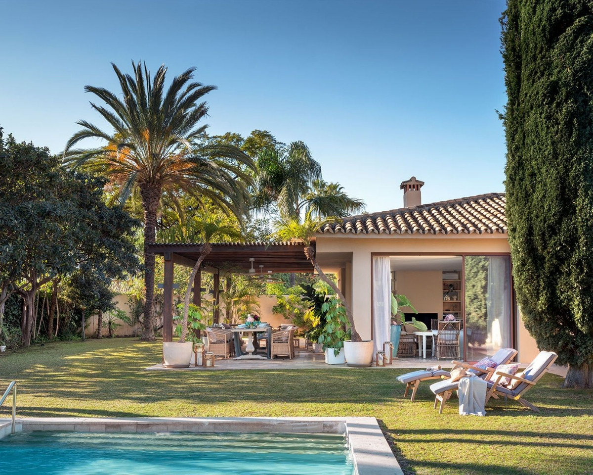 Magnifica Villa en una parcela plana, terminada con los más altos estándares de calidad, conduce a un hall de entrada y un patio vegetal. La villa de estilo bungalow ofrece un amplio salón con acceso a la gran terraza, un comedor y una cocina americana totalmente equipada con nevera para vinos,Se puede encontrar un trastero, un cuarto de lavado con lavadora y secadora, así como un aseo de invitados. Un gran jardín de uso privado. La casa fue completamente remodelada en 2022. La suite principal tiene muchos armarios y hay una zona habilitada para vestidor y acceso a la terraza. Ubicada en el corazón del valle del golf de Aloha, Nueva Andalucia, esta casa se encuentra a poca distancia de la casa club, la piscina y el restaurante en Aloha Golf. También se puede llegar a Puerto Banús en tan solo 3 minutos en coche. La orientación de la parcela es sur_sureste y ofrece bonitas puestas de sol y vistas al jardín, piscina, motañna y al campo de golf.Hay estacionamiento para 2 autos y un carrito de golf y mas parking fuera de la casa.