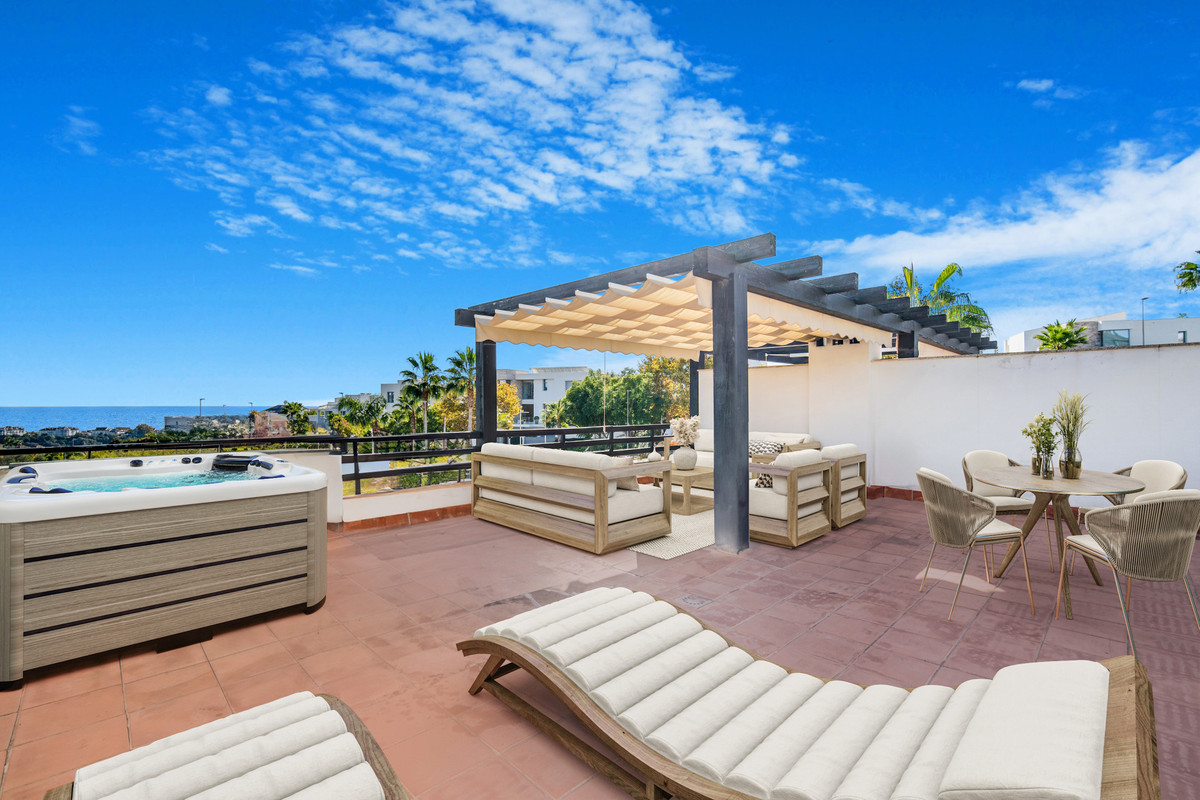 Fantástica casa de dos dormitorios con orientación sur en una urbanización cerrada de Santa Clara Golf, Marbella. Rodeado de hermosos campos de golf y a poca distancia de la playa, esta es una gran comunidad tranquila, con jardines bien cuidados y piscina comunitaria. La propiedad en el nivel de entrada tiene una sala de estar y comedor de planta abierta con una chimenea incorporada y acceso a la terraza cocina totalmente equipada también con acceso a la terraza y un aseo de ráfagas. El nivel inferior de la propiedad tiene dos dormitorios, ambos con baño en suite y acceso a una terraza y jardín. Desde el primer nivel tienes escaleras que conducen a un gran solárium con jacuzzi y increíbles vistas al mar. Otras características incluyen suelos de mármol, armarios empotrados, persianas eléctricas y dos plazas de aparcamiento privadas. Hay un gran potencial con esta propiedad y la posibilidad de hacer un tercer dormitorio.