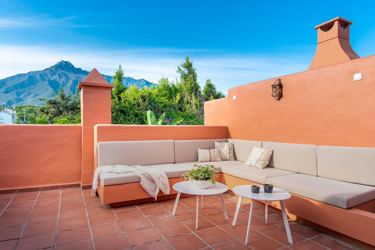 Ofreciendo una experiencia de vida excepcional, esta exquisita casa adosada se encuentra en la prestigiosa zona de Altos de Puente Romano, conocida por su elegancia y proximidad a la playa. Con una superficie total construida de 168 metros cuadrados, incluidos 138 cuadradosOfreciendo una experiencia de vida excepcional, esta exquisita casa adosada se encuentra en la prestigiosa zona de Altos de Puente Romano, conocida por su elegancia y proximidad a la playa. Con una superficie total construida de 168 metros cuadrados, incluidos 138 metros cuadrados de terrazas y un encantador jardín, esta propiedad ofrece un espacio habitable espacioso y cómodo.Al entrar, quedará cautivado por la cocina moderna totalmente equipada, perfecta para los amantes de la cocina y el entretenimiento. Con su diseño elegante y electrodomésticos de primera línea, esta cocina es el sueño de un chef. Junto a la cocina, la amplia sala de estar crea un espacio acogedor para relajarse y socializar, con una decoración elegante y abundante luz natural.Esta casa adosada cuenta con cuatro habitaciones, lo que garantiza un amplio espacio para la familia y los invitados. El dormitorio principal es particularmente impresionante, con un baño privado para mayor privacidad y comodidad. Las habitaciones restantes son igualmente espaciosas y están cuidadosamente diseñadas, brindando comodidad y tranquilidad.Ubicado dentro de un área privada segura, esta casa adosada ofrece un retiro tranquilo para sus residentes. Las áreas comunes bien mantenidas incluyen una piscina refrescante, que ofrece un escape encantador durante los calurosos días de verano. Los alrededores meticulosamente cuidados mejoran aún más el atractivo y la exclusividad de esta propiedad.La ubicación de este adosado es realmente inmejorable, con la playa y el reconocido Hotel Puente Romano a tan solo 7 minutos a pie. Disfrute de la comodidad de tener servicios de clase mundial y la playa a la vuelta de la esquina, mientras aún puede retirarse a la tranquilidad de su residencia privada.No pierda la oportunidad de adquirir esta excepcional casa adosada en Altos de Puente Romano. Con muebles nuevos incluidos, esta propiedad está lista para que usted se mude y la haga suya. Además, cuenta con un sótano totalmente equipado con espacio para dos coches. Reserve una visita hoy para asegurar su oportunidad de experimentar el lujo, la comodidad y la belleza que esta casa adosada tiene para ofrecer.