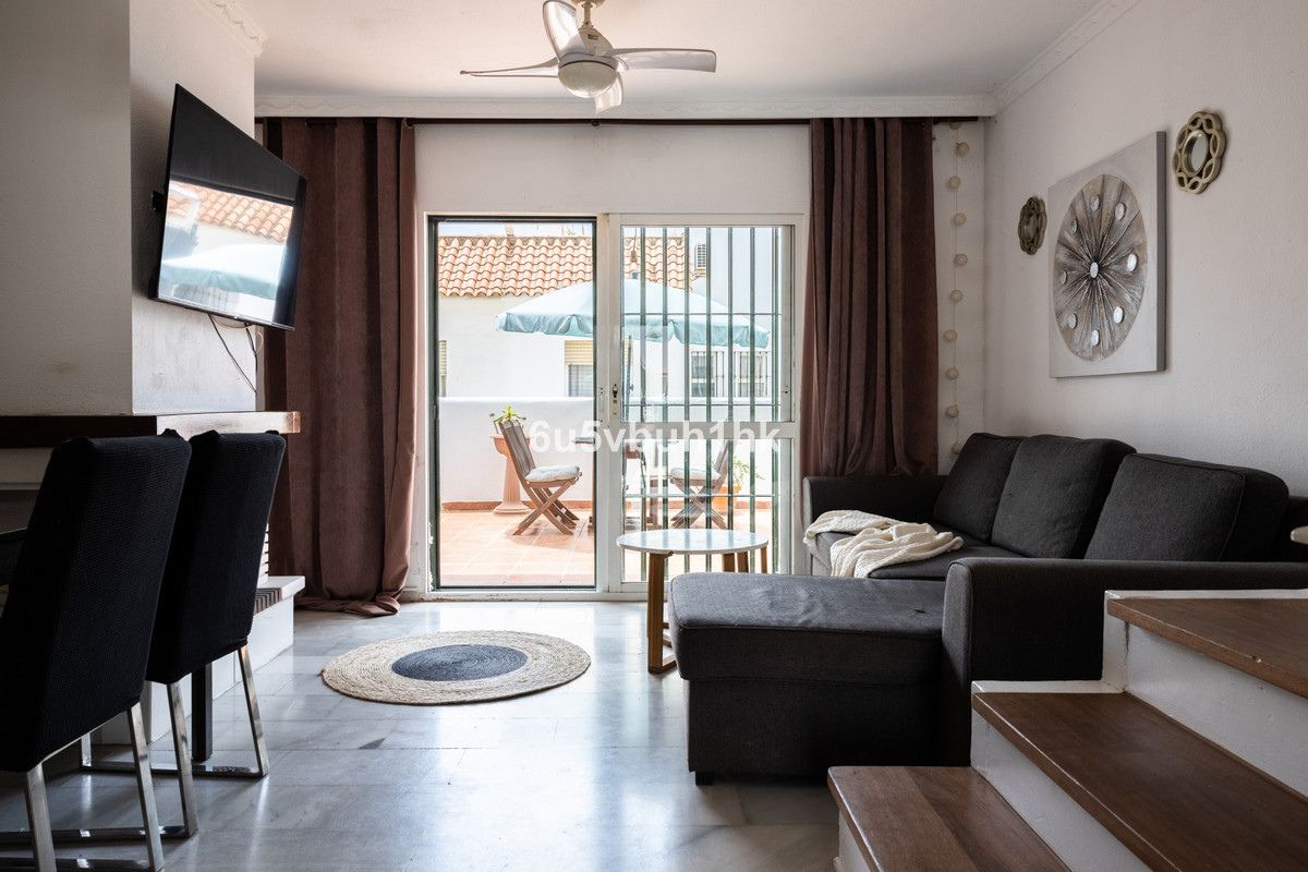 Encantadora casa adosada cerca de Fuengirola_Miramar ya poca distancia de la playa. Ubicada dentro de una comunidad establecida, esta propiedad ofrece alojamiento espacioso en 2 niveles. Entrando a la propiedad tiene un amplio salón con chimenea y 2 terrazas una orientada al este con sol de mañana y otra gran terraza de 25 metros con sol de tarde. Entrando a la propiedad se encuentra una cocina, sala de estar con chimenea y un aseo de invitados. Arriba hay 2 dormitorios dobles grandes y uno tiene una terraza privada con hermosas vistas a la montaña. El baño ha sido renovado y se comparte entre los dos dormitorios. La azotea privada de arriba tiene el tamaño de todo el piso y ofrece hermosas vistas abiertas a la montaña y al mar.La comunidad ofrece una piscina olímpica, hermosos jardines verdes y una cancha de baloncesto para usar también. Tiene fácil estacionamiento en la calle directamente afuera de la casa adosada. Esta es una propiedad interesante ideal para una familia con niños o como inversión. Estás a 5 minutos a pie de la playa de Fuengirola y del Castillo Sohail, el centro comercial Miramar también está a 5 minutos a pie. El aeropuerto de Málaga está a sólo 20 minutos en coche. Los gastos de comunidad son bajos y los gastos de funcionamiento anuales también son muy razonables.